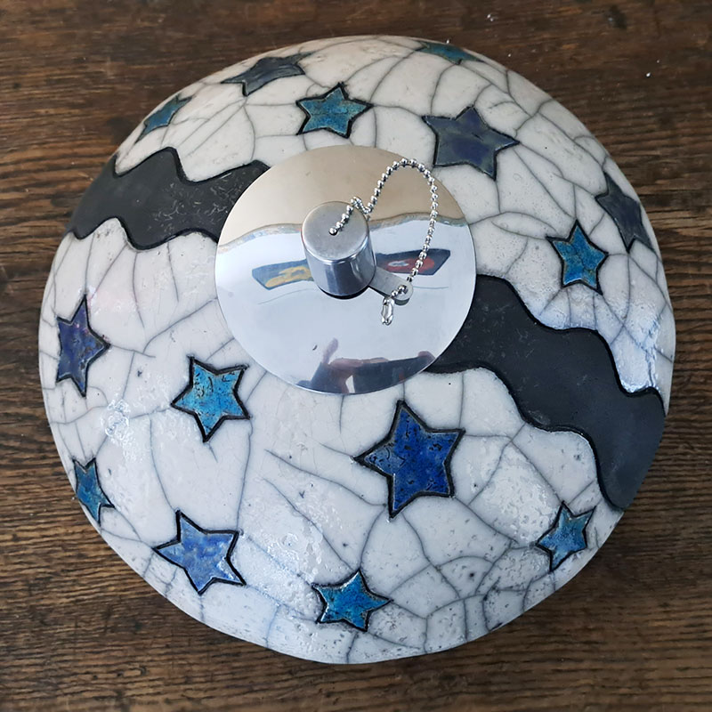 Schneller Brennprozess: Bei diesem Niedrigbrand werden die rotglühenden Werkstücke einzeln mit einer langen Zange bei Temperaturen um 1000° C aus dem Ofen entnommen und in einem Behälter mit organischem Brennstoff (Sägemehl, Laub, etc.) luftdicht eingebettet. Es entstehen dabei die typischen Craquelé-Effekte oder auch ein einzigartiges Farbspiel sowie der eigene Charakter jedes Stückes.